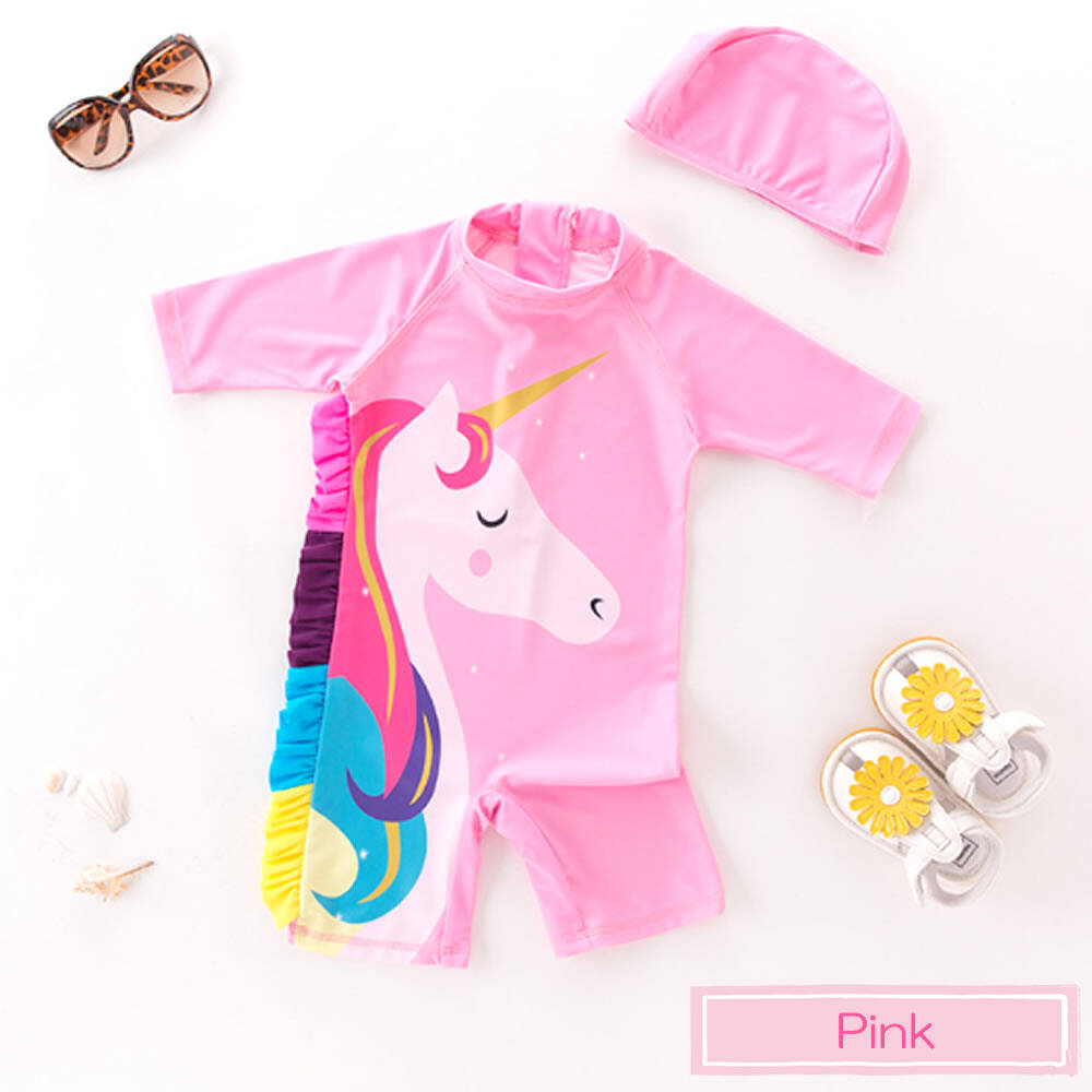 ベビー キッズ 水着 グレコ 七分袖 パンツ 帽子 日焼け 女の子 ガールズ ピンク パープル ユニコーン 2歳 3歳 4歳 5歳
