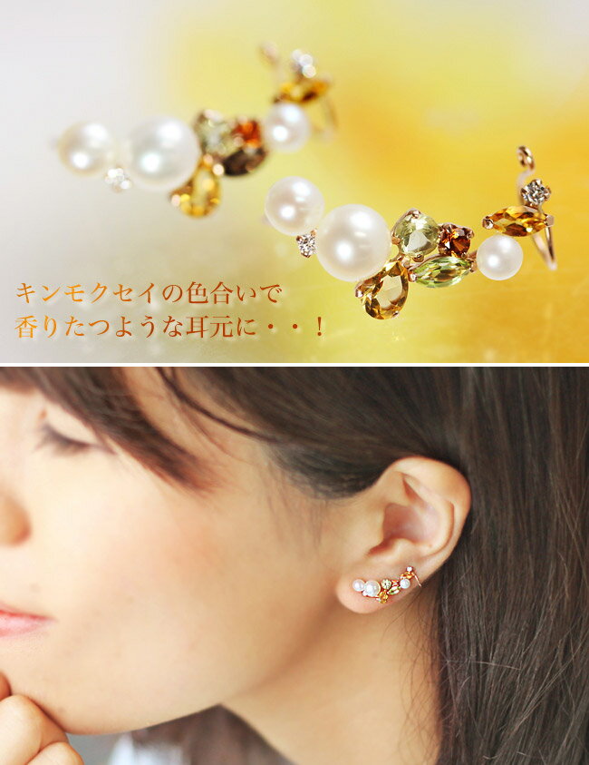 【ピアス派も、イヤリング派も!】 キンモクセイの色合いで、香りたつような耳元に・・! 【片耳専用】秋色キンモクセイグラデーション×ピンクゴールドピアス/ イヤリング・フレグラントオリーブカフ スペサタイトガーネット/シトリン/ハニークオーツ/パール/ キュービックジルコニア/スモーキークオーツ/ペリドット 当店の名前「cafe fragrant olive」・・ つまりキンモクセイ! そのキンモクセイの花をイメージした、 いまの季節にぴったりなイヤーカフピアス/イヤリングが できました! 今人気のイヤーカフと、 当店のシンボルが夢のコラボレーション! キンモクセイの華やかな香りが今にも漂ってきそうです! 大きさや形の違うシトリンや スペサタイトガーネット、ペリドットなど 合計10粒もぎゅぎゅっと散りばめたので、、 とっても華やか・・! キンモクセイの花に見立てたシトリンに、 大人っぽいスモーキークオーツと 元気なペリドット・・ お好きな方を選んでくださいね! まさに、ありそうでなかった カフェオリならではのイヤーカフです! ジュエルの大きさや配置にもこだわって おつくりしたので、ボリューム感やバランスも抜群! そしてなんといってもこの形! 両端にポストとクリップがそれぞれついていて、 片方のポストをホールにつけたら もう片方のクリップで耳たぶの上のほうで固定する 珍しいタイプとなっています! さらに、イヤリング派のお客さまのリクエストにおこたえして 両クリップタイプもご用意しました! ピアスホールが開いていない方でも このゴージャスなデザインをお楽しみいただけます★