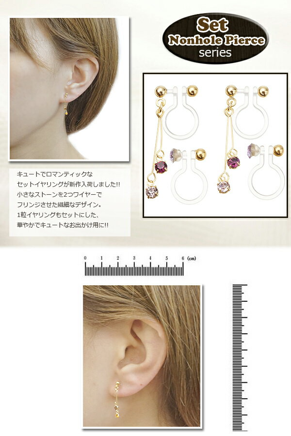 ギフト対応 素材: 真鍮製 プラチナロジウム/ゴールド/ ピンクゴールドコーティング ラインストーン ノンホールピアス イヤリング ポリプロピレン製 サイズ: 全長:約縦22mm×横3.5mm ストーン:約3.2mm ポストの太さ:約1.2mm キュートでロマンティックなセットイヤリングが 新作入荷しました 小さなストーンを2つワイヤーでフリンジさせた繊細なデザイン。