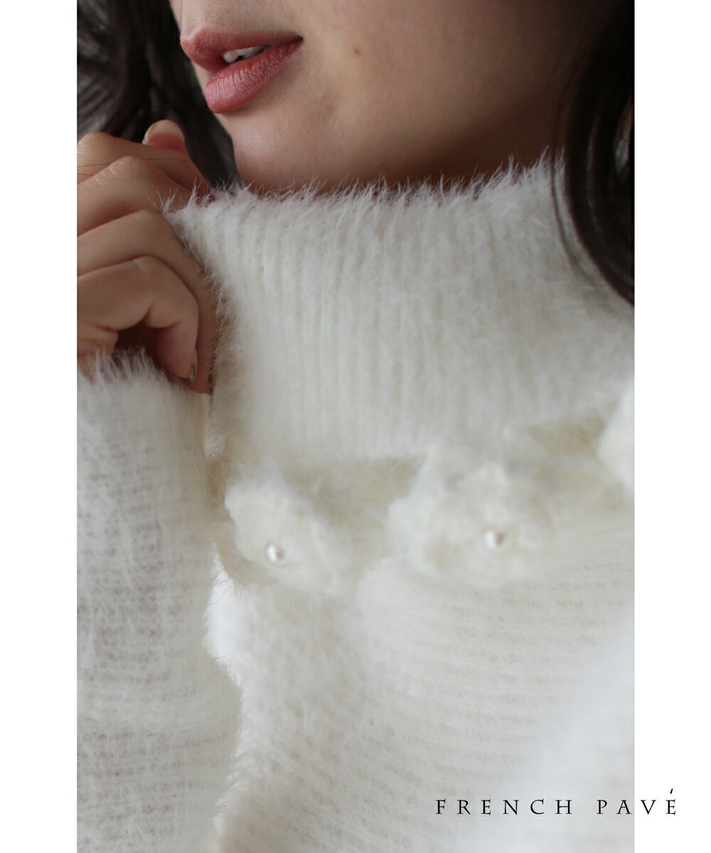 「french pave」お花コサージュ。ふんわりオフショルダーネックニットトップス